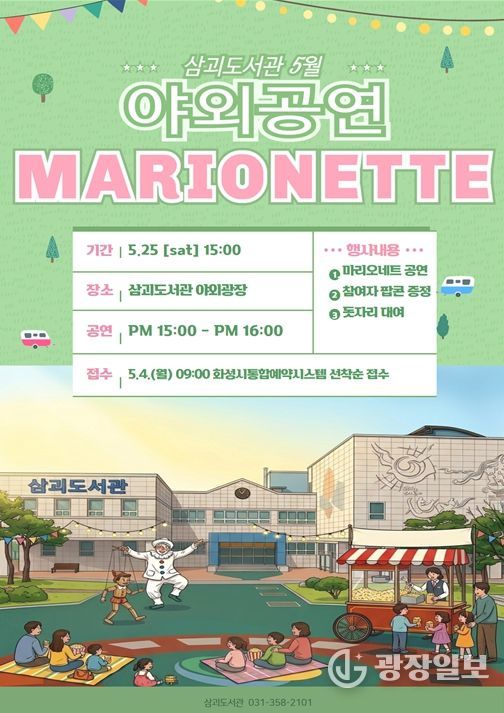 광장일보 나병석 기자 | 화성시립 삼괴도서관은 5월 가정의 달을 맞아 오는 5월 23일, 도서관 야외광장에서 가족 단위 이용자를 위한 특별한 문화행사를 운영한다. 따뜻한 봄날의 야외 공간에서 누구나 편안하게 즐길 수 있도록 마련된 이번 행사는 도서관을 찾는 시민들에게 색다른 문화 경험과 여유로운 시간을 제공할 예정이다.
