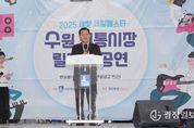 광장일보 나학천 기자 | ‘제28회 수원시 가로 환경관리원 한마음 체육대회’에 참석한 이재준 수원시장은 “보이지 않는 곳에서 묵묵히 일하시는 가로 환경관리원 여러분께 감사드린다”고 말했다. 19일 제38호 광장(권선구 탑동)에서 열린 한마음 체육대회에는 수원시 환경관리원 300여 명과 그들의 가족이 함께했다. 이재준 시장은 “다음 주부터 제62회 화성문화제, 수원화성 미디어아트가 시작돼 평소보다 쓰레기가 늘어날 것으로 예상된다”며 “행사 때마다 거리를 깨끗하게 만들어 주시는 여러분 덕분에 수원시가 더 빛난다”고 말했다. 이날 행사는 모범 환경관리원 표창(수원시장 표창 5명, 수원시의장 표창 4명)과 줄다리기, 하나로줄넘기, 제기차기, 족구, 배구, 남·여 계주 등 체육대회로 이어졌다.