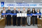 광장일보 박균현 기자 | 수원특례시와 (사)국제관광인포럼(TITF)이 ‘글로벌 관광도시 수원’을 만들어 가기 위해 협력한다. 수원시와 (사)국제관광인포럼은 2일 시청 상황실에서 업무협약을 체결하고, ‘제5회 세계관광산업콘퍼런스 개최(6월 5일~6일)’와 ‘2026~2027 수원 방문의 해’의 성공적인 추진을 위해 협력하기로 했다. 협약식에는 이재준 수원특례시장과 국제관광인포럼 김정배 회장, 신연성 부회장, 금기형 사무총장, 신중목 후원회장, 연정아 이사 등이 참석했다. 양 기관은 협약에 따라 ‘제5회 세계관광산업콘퍼런스 공동 개최·운영’, ‘수원시 관광자원 홍보·국제 관광시장 확대 등을 협력하기로 했다. 수원시는 이번 협약을 계기로 국제 관광 네트워크를 확대하고, 수원의 관광자원과 도시 경쟁력을 세계에 알려 ‘1500만 관광객 시대’를 열 계획이다. (사)국제관광인포럼은 2013년 문화체육관광부 인가를 받아 설립된 관광 분야 전문 단체다. 국내·외 관광 전문인 간 교류 협력을 바탕으로 세계 관광산업 발전과 지속가능관광 육성을 지원하고 있다. 김정배 국제관광인포럼 회장은 “‘