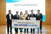 광장일보 박균현 기자 | 수원특례시 농업기술센터가 ‘2025년 경기도 농촌진흥사업 평가’에서 우수 기관으로 선정돼 경기도지사 표창을 받았다. 시상은 26일 열린 시군농업기술센터소장 업무협의회 중 진행됐다. 경기도는 20개 시군 농업기술센터를 대상으로 2025년 농촌진흥사업 추진 실적을 ▲지도정책 ▲기술보급 ▲농촌자원 ▲농촌진흥사업 활성화 등 11개 분야 33개 지표를 기준으로 평가했다. 수원시 농업기술센터는 농업교육과 도시농업을 체계적으로 운영하고, 농업인 맞춤형 기술 지원을 강화한 점에서 높은 평가를 받았다. 또 ▲신규농업인 양성 교육 운영 ▲시민농장·과수공원 등 도시농업 활성화 ▲농업인 단체 육성 ▲신기술 보급 확대 등 다양한 사업을 추진하며 농업인의 편익과 소득 증가에 이바지한 점도 좋은 평가를 받았다. 수원시 관계자는 “이번 수상은 농업인의 삶의 질 향상과 지역 농업 경쟁력 강화를 위한 노력이 인정받은 결과”라며 “앞으로도 변화하는 농업 환경에 대응할 수 있도록 맞춤형 기술 지원과 교육을 지속해서 추진하겠다”고 말했다.