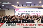 광장일보 이현나 기자 | 강원특별자치도 범국민추진협의회(협의회장 최양희, 추진단장 김천수)가 11월 21일 11시, 춘천 스카이컨벤션 2층 컨벤션홀에서 강원특별법 3차개정 조속 통과 촉구 결의대회를 개최했다. 당초 정기총회를 개최할 예정이었으나 어제(11월 20일) 국회 행정안전위원회 법안소위에서 강원특별법 3차 개정이 논의가 불발되자 긴급 행동에 나섰다. 이날 결의대회에는 범추협 위원들을 비롯해 고문직을 맡고 있는 김진태 도지사, 김시성 도의회 의장 등 200여 명이 참석하여 조속 통과를 촉구하는 목소리를 높였다. 최양희 협의회장은 “오늘은 강원특별자치도의 성과를 함께 축하하는 날이 돼야 했지만, 어제 행안위에서 3차 개정을 또 미루는 바람에 오히려 우리의 결의를 더 크게 보여줘야 하는 날이 됐다”라며, “각 지역에서 올라오신 위원 여러분의 지혜와 네트워크가 어느 때보다 절실하다”라고 말했다. 김진태 강원특별자치도지사는 “3차 개정안이 처음 국회에 올라간 게 작년 9월인데, 1년이 넘도록 단 한 번도 심사를 하지 않았다”라며, “5극 3특을 강조하면서 특별자치도 법은 시간이 없다고 국회 심사가 미뤄지는