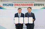 광장일보 주재영 기자 | 전북특별자치도교육청이 학생 선거교육 및 민주시민교육 활성화를 위해 전북특별자치도선거관리위원회와 협력 체계를 구축한다. 유정기 교육감 권한대행과 경범훈 전북선관위 사무처장은 9일 도교육청 5층 회의실에서 양 기관 관계자 10여 명이 참여한 가운데 ‘주권자시민교육 활성화를 위한 업무협약’을 체결했다. 이번 협약은 ‘교실에서 배운 민주주의, 미래를 여는 나의 권리’를 비전으로 선거의 의미와 원칙을 이해하고, 자율과 책임의 균형을 갖춘 시민으로의 성장을 돕기 위해 마련됐다. 협약에 따라 양 기관은 △미래·새내기 유권자 대상 선거교육 및 민주시민 교육 활성화 △교원 대상 참정권교육 관련 연수 프로그램 공동기획·운영 △모의선거와 토론수업, 체험형 교육 중심 참여형 시민교육 프로그램 운영 등 3개 분야 사업을 공동 추진한다. 전북교육청은 학교 현장과의 연계, 교육 대상자 참여 지원 및 교육 여건 조성을 담당하고, 전북선관위는 도내 학생과 교원을 대상으로 선거 및 참정권교육 관련 전문 인력과 교육자료, 프로그램 운영을 맡는다. 특히 단순히 선거와 정치참여를 배우는 것을 넘어