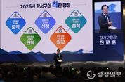 광장일보 주리아 기자 | 진교훈 서울 강서구청장이 14일 “지역의 수많은 현안들을 하나하나 해결하면서 구민의 삶에 착! 다가가는 구정을 펼치겠다”고 강조했다. 진 구청장은 이날 오후 코엑스 마곡에서 열린 ‘2026년 신년인사회’에서 올해는 도전과 혁신으로 구민과 함께 성장하는 도약의 해가 될 것”이라며 이같이 말했다. 진 구청장은 ▲균형발전 도시에 도착 ▲안전‧안심 생활에 안착 ▲미래경제 도시에 선착 ▲복지‧건강 구민 곁에 밀착 ▲교육‧문화 일상에 정착 등 5가지 핵심전략을 제시하며 “구민이 일상에서 체감할 수 있는 착한 행정을 펼쳐나가겠다”고 재차 강조했다. 가장 먼저 제시한 과제는 고도제한 완화 신속 이행과 주거 환경 개선이다. 그는 ”고도제한 완화를 위한 밑그림은 그려졌지만 조기 시행과 강서구에 최적의 방안이 적용될 수 있도록 끊임없이 노력하겠다“며 ”지역 곳곳에서 추진 중인 재개발·재건축 등 정비사업들도 차질 없이 추진해 나가겠다“고 말했다. 또한, 대장홍대선 31년 개통, 강북횡단선 재추진 등을 통해 교통 인프라를 확충하겠다는 구상도 밝혔다. 이어 폭우, 폭설 등