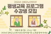 광장일보 주재영 기자 | 강화군노인복지관(관장 윤심)이 오는 12일~16일, 어르신들의 활기찬 노후와 평생학습 기회 확대를 위한 ‘2026년 평생교육 프로그램’ 수강생을 모집한다고 밝혔다. 2026년 평생교육 프로그램은 강화군에 거주하는 만 60세 이상의 어르신을 대상으로 진행되며 ▲건강 증진 6과목 12강좌 ▲교양교육 13과목 24강좌 ▲여가․취미 18과목 30강좌 ▲정보화 1과목 3강좌 ▲기획프로그램 6과목 9강좌 등 어르신들의 관심과 수요를 반영한 다양한 프로그램으로 구성된다. 노인복지관은 이번 프로그램을 통해 어르신들이 일상에서 배움을 이어가고 사회적 교류를 확대할 수 있도록 지원한다는 계획이다. 접수는 1월 12일~16일까지 진행되며, 강화군노인복지관으로 방문 접수가 가능하다. 모집인원 초과 시에는 공정성을 위해 컴퓨터 추첨을 통해 수강생을 선발할 예정이다. 2026년 평생교육 프로그램은 오는 2월 2일~12월 11일까지 운영될 예정이다. 윤심 관장은 “평생교육 프로그램은 단순한 여가 활동을 넘어 어르신들의 자기 계발과 사회참여를 돕는 중요한 역할을 지닌다”며, “많은 어르신이