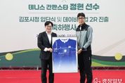 광장일보 주재영 기자 | 김포시는 17일 솔터실내테니스장에서 대한민국 테니스 스타 정현 선수의 김포시청 직장운동경기부 테니스팀 입단을 기념하고, 데이비스컵 2라운드 진출을 축하하는 행사를 개최했다. 이날 행사에는 김병수 김포시장을 비롯해 임청수 김포시체육회장, 박헌규 김포시테니스협회장과 테니스 관계자 및 동호인 등이 참석해 자리를 빛냈다. 행사는 시민과 동호인을 대상으로 한 팬 사인회를 시작으로 정현 선수의 주요 활약상을 담은 영상 상영, 기념 퍼포먼스, 입단 소감 및 축사 순으로 진행됐다. 특히 이날 행사에서는 정현 선수가 최근 데이비스컵 경기에서 실제 착용한 유니폼을 기념 액자로 제작해 김병수 시장에게 전달하는 의미 있는 시간이 마련됐다. 해당 유니폼은 국가대표 경기 특성상 소속팀 마크를 부착할 수 없음에도 불구하고, 정현 선수가 김포시청 입단을 기념하고 김포시를 알리기 위해 대한테니스협회에 요청해 특별히 김포시청 마크를 부착하고 출전한 것으로 알려져 의미를 더했다. 이어 김병수 시장은 정현 선수에게 꽃다발을 전달하고, 정현 선수의 유니폼에 김포시청 마크를 부착하는 퍼포먼스를 통해 김포시청 선수