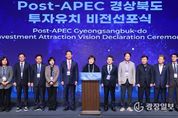 광장일보 주재영 기자 | 경상북도는 27일 서울 인터컨티넨탈 호텔에서 POST APEC 경상북도 투자유치 비전 선포식을 개최했다. 선포식에는 양금희 경상북도 경제부지사와 22개 시군 단체장, 아시아·태평양 20개국 대사관과 투자자, 대한상공회의소, 경제인 등이 참석한 가운데, POST APEC 경상북도 투자유치 이니셔티브를 발표하고 다 함께 의지를 다졌다. 이날 선포식은 공항투자분야 APEC 성과 발표, POST APEC 경상북도 투자유치 이니셔티브 브리핑, 비전 선포문 낭독, 경제부지사 및 22개 시군 단체장 선포문 서명 세리머니, 기념 촬영 순으로 진행됐다. 먼저 APEC 기간을 전후한 공항투자분야 주요 성과 발표로 지난 2024년 APEC 개최지 최종 선정에 힘을 보탠 ‘포항시·경주시·포항경주공항·경북문화관광공사 5개 기관’의‘APEC 정상회의 유치 및 포항경주공항 국제선 취항을 위한 업무협약’체결을 시작으로 APEC 성공 개최를 위한 ‘KOTRA, 한국아태경제협회’와의 업무협약을 연이어 체결했다. 또한, APEC 개최 준비와 연계한 ‘경주 SMR국가산단 투자설명회’, 경상북도 투자대회 ‘데모