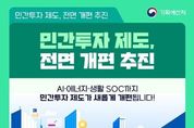 광장일보 주재영 기자 | AI·에너지·생활 SOC까지 민간투자 제도가 새롭게 개편됩니다! 1. 민간투자 제도란? 사회 기반 시설에 대한 민간의 투자를 촉진하여 창의적·효율적으로 사회기반시설을 확충·운영하는 제도 제도 도입 이후 30년 동안 총 872개 사업, 약 154조 원 규모의 민자사업 추진 → AI 등 신산업 분야, 노후시설 성능 개선 등 급증하는 투자 수요에 대응하기 위해서는 재정과 민간투자의 병행이 필수! 2. 이렇게 달라집니다. - 신사업·신유형 확대 - 국민 참여 확대 및 국민 생활 편익 증진 - 지방의 민자 활성화 및 민자사업의 안전 강화 - 절차 단축 등 사업 추진 여건 개선 4대 분야 20개 과제 마련으로 '민간투자의 패러다임 전환' 3. ① 신사업·신유형 확대 AI 데이터센터, 전력망, 철도 복합 시설 등 신산업·신유형 분야에 민간투자 활용 전통적 SOC(도로·철도 등)에서 벗어나 신산업 분야에도 민자 방식을 도입하고, 단순 운영형 민자 신설, 대상지 공모 방식 개선 등으로 신유형 사업 방식을 활성화합니다. ② 국민 참여 확대 및 편익 증진 일반 국민이