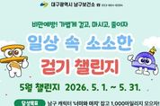 광장일보 주재영 기자 | 대구 남구는 오는 5월 지역주민의 신체활동 활성화와 생활 속 걷기 실천을 위해 “2026년 일상 속 소소한 '걷기 챌린지'”를 운영한다고 밝혔다. 2026년 걷기챌린지는 5월을 시작으로 6・9・10월 각 한 달씩 총 4회로 진행되며, 전년도 주민의 호응이 좋았던 챌린지를 구성하여 주민들의 적극적인 참여와 호응을 이끌어낼 예정이다. 챌린지의 첫 시작인 5월 챌린지는 기존의 단순 걸음 수 측정 방식에서 벗어나 남구의 대표 캐릭터인 ‘너미’와 ‘마지’를 활용한 증강현실 요소와 마일리지 시스템을 도입해 걷기의 재미를 극대화한 것이 특징이다. 5월 1일부터 31일까지 한 달간 진행되며 남구의 캐릭터 너미・마지 잡기와 걷기(걸음수)로 마일리지를 모아 총 1,000마일리지를 획득하면 챌린지를 성공하게 된다. 남구 전역에 숨어있는 '너미'와 '마지'를 찾아 누르면 10~100마일리지, 걷기 150걸음 당 1마일리지가 적립되며 남녀노소 누구나 남구의 캐릭터를 잡으며 걷기에 참여할 수 있다. 참여방법은 스마트폰에서 ‘워크온’을 설치한 뒤 ‘대구남구보건소’커뮤니티를 가입하여 5