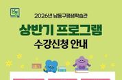 광장일보 주재영 기자 | 인천시 남동구 평생학습관은 구민의 자기 계발과 지적 성장을 위해 오는 24일부터 ‘2026년 상반기 평생학습 프로그램’ 학습자를 모집한다고 20일 전했다. 상반기 프로그램은 3~5월까지 운영되며, 일상의 활력을 더하고 실질적인 역량을 강화할 수 있는 실용적인 강좌들로 꾸려졌다. 특히, ‘2025년 평생교육 강사학교’ 과정을 이수한 강사들이 지역사회와 시민의 삶을 주제로 직접 기획⋅개발한 강좌들이 다수 개설됐다. 주요 강좌로는 ▲남동구의 색(色)다른 이야기 ▲나의 감정을 안아주는 예술이야기 ▲생성형 AI로 만드는 나의 영상 콘텐츠 ▲그림책과 공예 테라피로 나를 찾는 ‘다시, 봄’ 등 모두 4개 과정이 운영된다. 이와 함께 전 연령층의 학습 수요를 반영한 다양한 강좌도 운영된다. ▲시니어(65+) 스마트폰 입문 클래스 ▲바리스타 2급 자격과정 ▲오뒷세우스 깊게 읽기 ▲장애인과 비장애인이 함께하는 생태탐방 등 실용성과 인문적 소양을 아우르는 프로그램이 준비돼 있다. 수강 신청은 남동구평생학습관 홈페이지에서 선착순으로 진행되며, 남동구민 또는 남동구 내 직