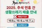 광장일보 이현나 기자 | 태백시는 추석 연휴 기간 원활한 생활폐기물 수거와 쾌적한 도시 환경 유지를 위해 연휴 전인 10월 3일·4일, 연휴 후인 8일·9일에 생활폐기물을 정상 수거한다고 밝혔다. 연휴 동안에는 배출일을 반드시 준수해야 하며, 특히 단독주택 지역은 장기간 방치로 인한 악취와 환경오염이 발생하지 않도록 각별한 주의가 요구된다. 또한, 시는 10월 3일부터 9일까지 ‘생활폐기물 대책상황반’과 기동처리반(생활환경팀 )을 운영해 불법 투기 및 관련 민원에 신속히 대응할 방침이다. 태백시 관계자는 “시민 여러분의 작은 협조가 더 깨끗한 명절을 만드는 힘이 된다”며 “생활폐기물은 3·4일과 8·9일 정상 수거가 이뤄지니 반드시 기억해 주시기 바란다”고 말했다.