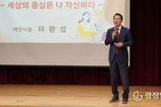 광장일보 주재영 기자 | 이완섭 서산시장이 20일 해미중학교 학생 180여 명을 대상으로 진로 특강을 진행했다. 이번 특강은 ‘세상의 중심은 나 자신이다’를 주제로 학생들에게 올바른 가치관 형성과 진로 선택에 도움이 될 조언을 전하고자 마련됐다. 이 시장은 “작은 눈덩이가 굴러가 큰 눈사람이 되듯, 작은 꿈이라도 품고 키워가는 과정이 무엇보다 중요하다”라며 “학생들에게 자기 자신을 믿고 가능성에 한계를 두지 말아야 한다”라고 말했다. 또한, 청소년이 빠지기 쉬운 ‘습관의 덫’에서 벗어나기 위해 일상 속 작은 변화를 만드는 행동의 실천이 필요하다고 강조했다. 이어, 긍정적인 사고와 적극적인 행동과 함께 어떤 어려움에서도 포기하지 않고 끝까지 도전하는 자세를 당부했다. 특히, 사회에서 중요하게 여겨질 자세로 ‘5S5품’을 소개했다. 5S는 친절(Smile), 간편(Simple), 유연(soft), 신속(Speed), 깔끔(Smart)을, 5품은 두품(창의), 입품(칭찬), 심품(감성), 손품(소통), 발품(현장)을 뜻한다. 특강이 마무리된 후에는 학생들과 자유롭게