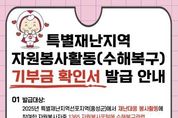 광장일보 이현나 기자 | 홍성군자원봉사센터는 지난해 군에 기록적인 폭우가 내리며 특별재난지역으로 선포됨에 따라, 수해복구 현장에서 자원봉사활동에 참여한 자원봉사자를 대상으로 ‘특별재난지역 자원봉사용역 등에 대한 기부금 확인서’를 발급한다고 밝혔다. 이번 기부금 확인서는 특별재난지역 수해복구에 참여한 자원봉사자의 봉사활동을 사회적으로 인정하고, 연말정산 및 종합소득세 신고 시 소득공제 혜택을 받을 수 있도록 지원하기 위한 것이다. 발급 대상은 2025년 홍성군 수해복구 자원봉사활동에 참여하고, 1365자원봉사포털에 수해복구 관련 봉사시간이 입력된 자원봉사자이며, 신청은 내달 13일까지이다. 신청을 희망하는 자원봉사자는 홍성군자원봉사센터 공지사항을 참고하여 기부금 확인서 서식을 내려받아 파란색 표시된 항목을 작성한 후, 기관 이메일(cnvc14@v1365.or.kr)로 제출하면 되고, 방문 접수를 희망할 시 센터로 직접 방문하거나, 가까운 읍·면행정복지센터에 제출하면 된다. 발급된 기부금 확인서는 연말정산 시 소득공제 항목에 기재하여 증빙자료로 제출하거나, 종합소득세 신고 시 활용할 수 있다. 기부금