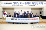 광장일보 주재영 기자 | 전라남도 시군 의회 의장협의회는 지난 10월 1일 영광군의회에서 개최된 제307회 정례회의에서“광주광역권 개발제한구역 전면 해제 촉구 건의안”을 만장일치로 채택했다. 이번 건의문은 장성군의회 심민섭 의장이 발의한 것으로 광주광역권을 둘러싼 4개 시 군(장성, 담양, 화순, 나주)에 수십년간 과도한 개발제한구역을 지정하면서 수도권에는 과밀억제를 명분으로 개발제한구역 제도를 더욱 엄격히 적용해야 하나, 오히려 수도권을 중심으로 해제를 해주면서도 비수도권인 광주광역권에는 여전히 경직되고 일률적인 규제를 강요하는 것은 명백한 지역 역차별이자 지방시대 국가균형발전 정책에도 역행하는 조치라며 정부에 전면 해제를 강력히 요구했다. 건의문에는 ▲ 광주광역권 개발제한구역 전면 해제 ▲ 지역발전에 대한 사항을 지방정부가 결정할 수 있도록 모든 권한을 자치단체에 이양할 것을 촉구하는 내용을 담고 있으며, 건의문을 발의한 심민섭 의장은“광주광역권 개발제한구역은 시대적 역할을 다한 만큼, 지역간 균형발전을 실현하고 나아가 국가 전체의 지속가능한 발전을 도모하기 위해서 개발제한구역 전면 해제가 반드시 필요하다.”고 강조했다