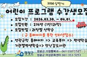 광장일보 주재영 기자 | 영광군은 어린이의 건강한 성장과 다양한 문화·예술 체험 기회를 제공하기 위해 오는 3월 30일부터 4월 1일까지 2026년 상반기 어린이 프로그램 수강생을 모집한다고 밝혔다. 이번 프로그램은 9세 이하 아동을 대상으로 신체활동과 예술, 정서발달을 돕는 다양한 체험형 교육으로 구성되어 ▲베이베붐 ▲트니트니 ▲튼튼쑥쑥 키즈요가 ▲키즈발레 ▲감성동화구연 ▲키즈드럼 ▲사물악기 체험놀이 ▲우리노래 우리놀이 ▲발표력동화구연 등 총 9개 분야 18개 강좌로 운영될 예정이다. 특히 신체활동 중심 프로그램부터 음악·놀이·동화구연 등 감성 발달을 돕는 프로그램을 다양하게 마련해 아이들의 신체 발달과 창의력, 표현력 향상에 도움을 줄 것으로 기대된다. 모집인원은 총214명이며, 강좌별로 소규모 인원을 운영해 보다 집중도 높은 교육 환경을 제공할 계획이다. 수강 신청은 선착순으로 진행되며 1인 1과정 신청이 가능하고 교육장소는 여성문화센터와 홍농읍복지회관 4층에서 제공할 계획이다. 수강신청은 영광군에 주소를 두고 거주하는 아동이면 누구나 가능하고, 영광군 홈페이지를 통해 온라인으로