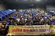 광장일보 주재영 기자 | 부산 중구는 11월 26일 롯데시네마 광복점에서 관내 어린이집 보육인 100여명이 참석한 가운데 '2025년 중구 보육인 한마음의 날'을 개최했다. 이번 행사는 보육인 윤리선언문 낭독으로 올바른 보육실천을 다짐하고 유공 보육교사에 대한 표창을 수여하며 보육인들의 헌신과 노고를 격려하는 자리로 마련됐다. 또한 아동학대 예방 교육을 진행하여 아동 권리 보호에 대한 인식을 더욱 높이는 시간을 가졌다. 교육 이후에는 영화 관람 프로그램이 이어져 보육인들의 사기를 북돋우고 보육서비스의 질을 한층 향상시키는 뜻깊은 자리가 됐다.