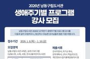 광장일보 주재영 기자 | 인천시 남동구 구립도서관은 3~12월까지 운영하는 ‘2026년 상·하반기 생애주기별 프로그램’에 함께 할 프로그램 강사를 공개 모집한다고 12일 밝혔다. 올해 구립도서관 4개관(남동논현, 소래, 서창, 만수2동어린이도서관)의 생애주기별 프로그램은 10개 분야로 구성돼 운영될 예정이다. 강사 모집은 유아·아동 대상의 영어·한국사·생태·미술·전래놀이·경제 등 8개 강좌와 성인 대상의 책 놀이·영어독서 지도 교육 등 2개 강좌를 대상으로 한다. 관련 분야 전공자, 교육과정 이수자, 자격증 소지자, 강의 경력자라면 누구나 강사로 지원할 수 있다. 지원자는 강사지원서·강의계획서·자기소개서 등 서류를 준비해 1월 16일까지 남동논현도서관 또는 서창도서관에 방문하거나 이메일을 통해 제출하면 된다. 구는 매년 강사 공개 모집을 통해 여러 분야의 우수한 강사를 발굴·선발하여 생애주기별 프로그램을 진행하며, 지역주민의 교육적 삶의 질 향상과 독서문화 활성화를 통해 지역 내 독서문화 진흥을 도모할 수 있기를 기대하고 있다. 자세한 사항은 남동구립도서관 홈페이지 또는 남