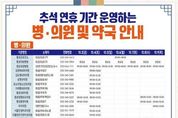 광장일보 이현나 기자 | 횡성군은 2025년 추석 연휴를 맞아 군민들의 건강과 안전을 보호하기 위해 10월 3일부터 10월 9일까지 7일간 특별대응기간을 설정하고, 응급진료체계를 강화한다고 30일 밝혔다. 연휴 기간 중 응급환자 진료 및 다수 사상자 발생 대비 횡성군보건소에 ‘응급진료대책 상황실’을 설치하고 당번 의료기관 및 약국 민원 안내, 응급의료기관, 문 여는 병·의원 및 약국 운영현황 점검 및 일일보고, 대규모 재난 발생 시 신속한 응급진료체계를 위한 비상연락 유지 등의 임무를 수행한다. 또한, 추석 당일인 10월 6일에는 횡성군보건소에서 오전 9시부터 오후 6시까지 일반진료를 실시하여 군민들의 의료서비스 불편을 최소화할 방침이다. 문 여는 병·의원 및 약국 현황을 확인하는 방법은 다음과 같다. - 전화 문의: 국번 없이 119 또는 129 또는 120 - 어플리케이션 사용: ‘응급똑똑’ 검색 - 인터넷 검색: ‘응급의료포털 E-Gen’ 검색 - 홈페이지 방문: 횡성군청 공식 홈페이지 김영대 횡성군보건소장은 “추석 연휴 기간 응급진료체계 구축