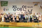 광장일보 주재영 기자 | 경상북도장애인복지단체협의회(회장 김재원)와 영덕군장애인연합회(회장 김동원)가 공동 주최·주관한 ‘제46회 장애인의 날 기념식’이 지난 20일 영덕국민체육센터에서 성황리에 개최됐다. ‘당연한 일상, 모두가 누릴 수 있도록’이라는 슬로건으로 열린 이번 기념식에는 황명석 경상북도 행정부지사(도지사 권한대행)와 황인수 영덕부군수(군수 권한대행), 임종식 경상북도교육감, 김성호 영덕군의회 의장 등 내빈과 장애인 단체 회원, 자원봉사자 등 1,300여 명이 참석해 자리를 빛냈다. 식전 행사로는 해파랑고고장구단의 신명 나는 무대와 영덕군 발달장애인들로 구성된 ‘블루아라합창단’의 감동적인 합창이 펼쳐져 참석자들의 큰 박수를 받았다. 이어지는 기념식에서는 장애인 복지 증진에 이바지한 유공자들에 대한 표창 수여와 함께 환영사, 축사, 장애인 권익 향상을 다짐하는 퍼포먼스가 진행됐다. 또한 행사 현장에는 18개의 홍보 및 체험 부스가 운영되어 풍성한 볼거리와 즐길 거리를 제공했다. 장애 예방 및 장애인 생산품 홍보를 비롯해 금연 캠페인, 장애인 인식 개선 캠페인, 달고나 만들기, 한궁 체험 등 다채로운 프
