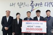 광장일보 나학천 기자 | 대전 대덕구는 21일 문평동 공장화재 피해 주민 지원을 위해 KT&G 대전공장(공장장 장재홍)으로부터 성금 2000만원을 기탁받았다고 밝혔다. 이번 성금은 지난 3월 20일 발생한 대덕구 문평동 공장화재로 피해를 입은 주민들을 지원하기 위해 마련됐다. 기탁된 성금은 대전사회복지공동모금회를 통해 전달되며, 화재로 어려움을 겪고 있는 피해 주민들의 생활 안정과 회복 지원에 사용될 예정이다. 장재홍 공장장은 “예기치 못한 화재로 어려움을 겪고 있는 주민들에게 조금이나마 힘이 되기를 바라는 마음으로 성금을 전달했다”며 “앞으로도 지역사회와 함께하는 나눔 활동을 지속해 나가겠다”고 밝혔다. 대덕구 관계자는 “어려운 상황에 놓인 우리 지역의 이웃을 위해 큰 나눔을 실천해 주신 KT&G 대전공장에 깊이 감사드린다”며 “소중한 성금이 피해 주민들에게 실질적인 도움이 될 수 있도록 최선을 다하겠다”고 말했다. 한편, KT&G 대전공장은 임직원들이 자발적으로 참여하는 사회공헌기금 ‘상상펀드’를 통해 지속적인 나눔 활동을 이어오고 있다. 상상펀드는 임직원이 매월 급여의