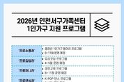 광장일보 주재영 기자 | 인천서구가족센터(센터장 심정흠)가 급증하는 1인가구의 사회적 고립을 예방하고 삶의 질을 높이기 위해 ‘2026년 1인가구 행복동행사업’의 본격적인 시작을 알리고 참여자 모집에 나섰다. 인천 서구는 최근 청라, 검단 신도시를 중심으로 1인 가구 비중이 급격히 증가하고 있는 지역이다. 이에 인천서구가족센터는 1인 가구의 라이프스타일을 반영해 경제, 건강, 심리 정서 등 실질적인 고민을 해결할 수 있는 다각적인 맞춤형 지원 체계를 구축했다. 올해 운영되는 프로그램은 참여자의 다양한 욕구와 생활 특성을 반영해 총 다섯 가지 테마로 구성되며, 재미와 전문성을 동시에 갖춘 맞춤형 프로그램으로 운영될 예정이다. 먼저, ▲프로소통러는 중장년 1인 가구 간 유대감 형성과 사회적 관계망 확장을 위해 동아리 활동을 지원하는 프로그램으로 참여자들이 서로 소통하고 교류할 수 있는 기반을 마련한다. ▲프로집밥러는 건강한 식생활 형성을 목표로 요리코칭과 식재료 활용 교육을 제공해 일상 속 균형 잡힌 식습관을 돕는다. ▲프로머니러는 경제적 자립과 안정적인 노후 설계를 지원하기 위한 자산 관리 교육을 통해 참여자의 재무 역량을