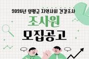 광장일보 주재영 기자 | 양평군은 질병관리청 및 양평군보건소와 공동으로 추진하는 ‘2026년 지역사회 건강조사’에 참여할 조사원 6명을 모집한다고 밝혔다. 지역사회 건강조사는 지역 주민의 건강 수준과 생활 습관, 만성질환 현황 등을 파악해 지역 특성에 맞는 보건 정책 수립의 기초 자료로 활용하기 위해 매년 실시되는 국가승인통계다. 이번 조사는 5월 16일부터 7월 31일까지 약 2개월 반 동안 진행되며, 조사 진행 상황에 따라 종료일은 변경될 수 있다. 모집 분야는 ‘2026년 지역사회 건강조사 조사원’으로, 근무 지역은 양평군 관내이며 모집 인원은 총 6명이다. 선발된 조사원은 조사 수행에 앞서 표본지점 확인을 위한 사전 조사를 실시하고, 조사 대상 가구로 선정된 표본가구를 직접 방문해 19세 이상 성인을 대상으로 스마트 기기(태블릿 PC)를 활용한 1대1 면접 조사를 수행하게 된다. 전형은 1차 서류 전형과 2차 면접 전형으로 진행된다. 군은 서류 전형에서 응시자의 자격 및 경력의 적합 여부를 심사하며, 1차 합격자를 대상으로 면접 전형을 실시한다. 원서 접수 기간은 3월 5일부터 13일까지이며