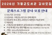 광장일보 주재영 기자 | 가평군도서관은 2026년 도서관 문화프로그램을 운영할 강사를 공개 모집한다고 11일 밝혔다. 모집 대상은 가평군도서관 문화프로그램 운영을 희망하는 강사로 거주지 제한은 없으나 가평군 거주자 또는 인근 지역의 강사를 우선 모집한다. 모집 분야는 유아부터 성인을 대상으로 하는 독서문화 프로그램을 비롯해 취미, 교양, 체험 등 도서관에서 운영 가능한 분야이다. 모집 기간은 올해 12월부터 상시 모집하고 있으며 제출서류를 준비해 가평군 도서관 4개소(한석봉, 설악, 청평, 조종)에 방문 또는 가평군도서관 홈페이지 공지사항에 기재된 이메일로 제출하면 된다. 제출된 서류는 가평군도서관 강사인력풀에 등록 및 관리되며, 추후 도서관 문화 프로그램 운영을 위한 강사로 활동할 수 있다. 기타 자세한 내용은 가평군도서관 홈페이지 공지사항을 참고하거나 가평군도서관으로 문의하면 안내받을 수 있다. 도서관 관계자는 “이번 공개 모집을 통해 유능하고 열정 있는 강사를 모집해 지역 주민에게 다양하고 유익한 프로그램이 운영될 수 있도록 최선의 노력을 하겠다”고 밝혔다.