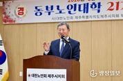 광장일보 주재영 기자 | 김완근 제주시장은 2월 11일 조천주민교류센터 회의실에서 열린 제21기 동부노인대학 졸업식에 참석해 축하 인사를 전했다. 이번 졸업식은 졸업생 32명과 내빈 등이 참석한 가운데 학사보고, 졸업증서 수여, 표창 수여, 축사 등의 순서로 진행됐다. 제주시 동부노인대학은 2년 과정의 교육프로그램으로, 어르신들의 삶의 질을 높이고 건강한 노후 생활을 지원하기 위해 운영되고 있다. 프로그램은 매주 화요일과 수요일 2시간씩 진행되며, 노인 교양, 건강관리, 정치·사회·시사 상식, 문화 체험 활동 등 다양한 내용으로 구성돼 있다. 김완근 제주시장은 “노인대학을 졸업하신 여러분께 진심으로 축하의 말씀을 드리고, 나이를 뛰어넘는 여러분의 열정과 도전은 우리 모두에게 큰 울림을 주고 있다”며, “병오년 새해 배움의 기쁨이 여러분의 삶의 버팀목이자 활력이 되어 언제나 건강하고 행복한 나날을 이어가시길 바란다”고 말했다.