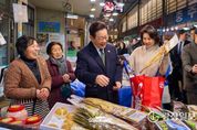 광장일보 주재영 기자 | 이재명 대통령과 김혜경 여사는 오늘 낮, 설 명절을 앞두고 충북 충주시에 위치한 무학시장을 찾아 지역 세밑 물가를 점검하고 상인들을 만나 현장 의견을 청취했다. 무학시장은 지난 1978년 노점상들의 정착을 위해 개설된 전통시장이며, 이번 방문은 설 민심을 청취하기 위한 민생 행보의 일환이다. 이 대통령과 김 여사는 시장 내 여러 상점을 들러 “새해 복 많이 받으세요”라며 인사를 했고, 상인과 시민들은 환호와 박수로 이 대통령 부부를 맞았다. 이 대통령 부부에게 더덕을 판매한 상인은 “덕분에 마수걸이를 한다”며 “오늘 장사가 잘될 것 같다”고 말해 웃음을 자아냈다. 다른 상인들도 “힘나게 해주셔서 감사하다”, “너무 고생 많으시다”며 인사를 전했다. 이 대통령 부부는 황태포, 시금치, 곶감과 깐밤 등 제수용품과 먹거리를 구입했고 백도라지, 마른 멸치, 배추전 등을 즉석에서 맛보기도 했다. 이 대통령 부부는 온누리상품권과 현금으로 결제했다. 김 여사가 물건을 고르는 사이 이 대통령은 상인들에게 “장사는 잘 되느냐”, “곧 설인데 어떠시냐”고 물었다. 정육점 사장은