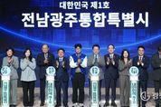 광장일보 주재영 기자 | 전라남도와 광주광역시는 전남광주통합특별법 국회 통과를 기념해 4일 나주 한국에너지공과대학 대강당에서 시도민 보고대회를 열어, 오는 7월 1일 출범하는 통합특별시의 비전과 향후 계획을 공유했다. 전남도지사, 광주시장, 시도의회 의장, 범시도민협의회 위원, 시도민 등 700여 명이 참석한 이날 행사는 ▲전남광주통합특별법 브리핑 ▲시도민이 기대하는 변화(QR코드 투표) ▲내가 바라는 전남광주통합특별시 희망 메시지 발표(시도민 대표 10명) ▲미래 다짐 퍼포먼스와 기념촬영 순으로 진행됐다. 정보무늬(QR코드) 투표로 진행된 ‘시도민이 기대하는 변화’에서는 더 많은 일자리와 기업 유치, 인구 감소 완화와 청년 정착, 의료·복지 서비스 개선, 교통·생활 인프라 확충 순으로 응답이 집계돼 지역경제 활성화에 대한 기대를 읽을 수 있었다. 분야별 시도민 대표 10명은 ‘내가 바라는 전남광주통합특별시’에서 통합을 계기로 청년이 정착할 일자리 도시, 첨단산업과 1차 산업의 조화를 통한 균형있는 발전, 문화도시 기반 조성을 통한 문화 향유기회 확대 등을 제시, 향후 전남광주통합특별시가 나아가야 할 시대적 요