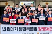 광장일보 주재영 기자 | 대구광역시의회는 2월 23일 오전 11시, 대구시의회 1층 현관에서 대구경북 행정통합 졸속 추진 규탄 성명서를 발표했다. 이날 성명서 발표에 모인 대구시의회 의원들은 통합의 대의에는 공감하나, 권한과 재정이 비어있고 대표성의 균형이 무너진 졸속 통합에는 단호히 반대한다고 목소리를 높였다. 대구시의회가 2024년 12월 통합에 동의한 것은 대구·경북 양 의회가 충분히 협의하고 선거구 획정이나 의원 정수 문제도 조정할 수 있는 충분한 시간적·제도적 여지가 있었으며, 중앙 권한의 실질적 이양과 핵심 특례, 안정적 재정 기반이 법률로 담보되는 ‘진정한 통합’을 전제로 한 결단이었다. 하지만 지금 국회에서 추진되는 통합특별법 수정안은 그 취지나 방향이 현저히 달라졌다고 이번 성명서 발표의 배경을 밝혔다. 또한, 현재 국회 법안에는 긴급 재추진의 핵심 동력이었던 20조 원 규모의 정부 재정 인센티브가 언급조차 없고 재정 특례와 권한 이양의 주요 조항 역시 상당 부분 빠져 숫자만 요란한 ‘속 빈 발표’에 불과한 구체적 담보 없는 재정 약속으로는 통합의 실효성을 말할 수 없다고 강조했다.