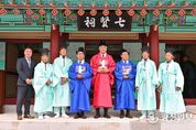 광장일보 이현나 기자 | 홍천향교는 공자님 오신 날(孔記 2576年)을 맞아 9월 25일 홍천향교 대성전에서 신영재 군수를 비롯한 지역 유림, 주민 등 150여 명이 참석한 가운데 추기 석전대제를 봉행했다. 중요무형문화재로 지정된 '석전대제'는 공자를 모시는 사당인 문묘에서 지내는 제사 의식으로, 홍천향교에서는 매년 음력 2월(공자 서거일)과 음력 8월 상정일(上丁日)(공자 탄신일)에 공자를 비롯한 성현들을 추모하고 공덕을 기리기 위해 석전대제를 봉행하고 있다. 이날 석전제에는 신영재 홍천군수가 초헌관으로, 문선옥 홍천교육지원청장가 아헌관으로, 박주선 홍천문화원장이 종헌관을 맡아 공자를 비롯한 성현들을 추모하고 공덕을 기리는 제향 행사를 진행했다. 대성전에 모셔진 성현에게 폐백을 올리는 전폐례를 시작으로 초헌례, 아헌례, 종헌례, 동·서분헌례, 음복수조례, 망료례 순으로 제례를 진행했다. 홍천향교 안상호 전교는 “옛 성현들의 학덕을 추모하고 가르침을 되새기는 추기 석전대제가 잘 치러질 수 있도록 지역 유림과 관내 각급 기관 및 사회단체의 적극적인 관심과 참여를 바란다”라고 말했다. 신영