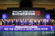 광장일보 주재영 기자 | 경주시가 2025년 APEC 정상회의 개막을 한 달 앞두고 시민의 힘을 하나로 모아 성공개최 의지를 다졌다. 시는 30일 경주실내체육관에서 ‘2025년 APEC 정상회의 성공개최 범시민실천결의대회’를 성황리에 개최했다고 밝혔다. 이번 행사에는 APEC 범시도민지원협의회(공동회장 박몽룡·이상걸) 소속 회원을 비롯해 유관기관, 시민단체, 자원봉사자 등 경주시민 3천여 명이 참석해 시민과 함께하는 APEC의 진정한 의미를 되새겼다. 특히 주낙영 경주시장을 비롯해 김석기 국회 외교통일위원장, 이동협 경주시의장, 최병준 경북도의회 부의장을 비롯해 시·도의원 전원이 참석해 시민과 함께 손님맞이 실천 결의를 다지고 성공 개최를 향한 열기를 더했다. 행사장 내부에는 시민단체들이 자체 제작한 손님맞이 실천 결의 현수막이 곳곳에 걸려 있어, APEC 성공개최를 향한 시민들의 뜨거운 참여 의지를 생생하게 보여주었다. 본행사에 앞서 참석자들은 ‘APEC 시민 10대 실천과제’를 함께 되새기며, 모든 시민이 APEC의 주인으로서 행동할 때 성숙한 시민의식과 지속가능한 경주를 만들어 갈