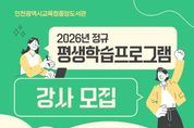 광장일보 주재영 기자 | 인천광역시교육청중앙도서관은 지역 주민에게 다양한 학습 기회를 제공하기 위해 ‘2026년 평생학습프로그램’ 강사를 공개 모집한다. 2026년 정규 평생학습프로그램은 상반기(3~5월)와 하반기(9~11월)로 나뉘어 각각 8회씩 운영되며, 모집 분야는 유아 대상 독후활동, 초등 1~2학년 대상 초등 영어, 성인 대상 AI 활용과 동영상 제작, 우쿨렐레, 금융·경제 등 총 5개 분야다. 서류 접수는 12월 23일부터 29일 오후 5시까지이며, 중앙도서관 누리집 공지사항에서 제출 서식을 내려받아 작성한 뒤 관련 서류와 함께 이메일로 제출하면 된다. 강사는 1차 서류심사와 2차 면접심사를 거쳐 최종 선정된다. 자세한 사항은 중앙도서관 누리집에서 확인할 수 있으며, 문의는 마을교육지원과로 하면 된다.