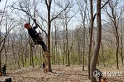 광장일보 이현나 기자 | 충북 괴산군 소수면의 아보리스트 실내 훈련센터. 육중한 나무 기둥에 로프를 두른 2급 과정 교육생들이 저마다 매듭법을 연습하느라 여념이 없다. 낯선 매듭법이 아직 손에 익지 않은 듯 매듭의 길을 찾아가던 로프가 가던 길을 되돌아 나오기 일쑤다. 1급 과정을 교육 중인 야외 교육장에서는 10kg이 넘는 묵직한 장비 벨트를 허리에 찬 남성이 능숙하게 로프를 던져 11m 높이의 나무 기둥에 걸었다. 아찔한 높이지만 거침이 없다. 밧줄 하나에 의지해 허공을 오르길 잠시 나무 상단부에 도달한 그가 예리한 톱으로 병든 가지를 골라내자 지켜보던 교육생들 사이에서 응원의 함성이 나왔다. 전국 최초의 ‘아보리스트(Arborist·수목관리사) 실내 훈련센터’가 문을 연 현장이다. 이곳에선 이제 비가 오나 눈이 오나 365일 ‘하늘 위의 나무 의사’들이 탄생한다 기후 위기 시대, 숲은 더 이상 방치된 자연이 아니다. 강풍으로 전깃줄을 덮치는 나무, 도심 속 고사목(死木), 기온 상승으로 창궐하는 병해충까지. 산림의 건강이 곧 사람의 안전과 직결되는 시대다. 하지만 장비조차 닿지 않는 거대 수목