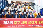 광장일보 주재영 기자 | 인천 중구의회는 12월 16일, 중구 평생학습관에서 개최된 제3회 중구사랑 글짓기 대회 시상식에 참석해 수상자들을 축하했다고 밝혔다. 이날 시상식에는 강후공 의원이 참석해 수상자들에게 축하 인사를 전하고, 참여 학생들과 관계자들을 격려했다. 강후공 의원은 “이번 대회를 통해 지역에 대한 이해와 자긍심이 자연스럽게 형성되고, 올바른 가치관과 표현력을 기르는 계기가 되길 바란다”라며 “중구의회도 지역 정체성과 공동체 의식을 높이는 다양한 문화·교육 활동을 지속적으로 응원하겠다”라고 밝혔다. 또한 앞으로도 주민 참여형 문화·교육 행사를 적극 지원하고, 지역사회와 소통하는 의정활동을 이어갈 계획이라고 말했다.
