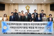 광장일보 주재영 기자 | 광산구의회가 21일 제301회 정례회 제1차 본회의에서 ‘마을공동체 활성화 기본법, 주민자치회 법제화, 사회연대경제기본법 제정 촉구 건의안’을 채택했다. 광산구의회는 조영임 의원(더불어민주당, 첨단1·2동)이 대표 발의한 건의안을 통해 “우리 사회는 물질적 풍요 속에서 공동체 해체, 사회적 고립이 심화되고 있다”며 “지역 문제와 불평등을 해결하기 위해서는 행정 중심의 개발 논리가 아닌 주민 스스로 공공의 가치를 만들어가는 풀뿌리 자치의 회복이 필요하다”고 강조했다. 이어 “마을은 민주주의의 출발점이자 주민이 일상에서 협력과 연대를 실천하는 삶의 학교지만, 마을공동체의 현행 제도는 사업 중심으로 분절되어 있고 법적 근거가 미비하다”고 지적했다. 또한 “주민자치회 역시 생활자치의 핵심으로, 주민이 직접 마을계획 수립과 예산 편성에 참여하는 제도적 권한이 보장돼야 한다”며 “주민자치회를 통해 지방분권의 완성과 생활민주주의를 실현할 수 있도록 법제화되어야 한다”고 설명했다. 아울러 “사회연대경제는 협동과 상생을 통한 사람 중심의 경제를 구현하는 새로운 대안”이라며 “사회연대경제기