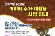 광장일보 주리아 기자 | 서울 성북구가 지역 내 커피박 별도 수거·재활용 체계를 구축하고 9월 15일부터 『성북구 커피박 수거·재활용 사업』을 본격 운영한다. 이번 사업은 2025년 상반기 사전신청한 카페를 포함해 추가 참여를 희망하는 업체까지 대상으로 2026년 12월까지 진행된다. 참여 매장은 건조한 커피박을 봉투에 담아 우리 동네 일반쓰레기 배출일과 배출시간에 맞춰 커피박 전용 수거함에 넣으면 된다. 상반기 사전 신청 업소는 별도 신청 없이 참여가 유지되며, 9월 13일까지 순차적으로 물품을 받아 바로 배출을 시작할 수 있다. 추가 참여를 원하는 업소는 매월 1일부터 15일까지 신청서를 작성해 이메일로 제출하면, 16일부터 31일까지 순차적으로 안내 문자 발송과 물품 배송이 이루어진다. 지원 물품은 커피박 전용 수거함이며, 익월 1일부터 배출 요령에 따라 배출하면 된다. 이번 사업을 통해 일반 생활폐기물로 처리되던 커피박이 별도로 분리수거되어 친환경 바이오연료나 퇴비 등으로 재활용된다. 이를 통해 폐기물 처리비용 절감과 온실가스 저감 효과가 기대된다. 이승로 성북구청장은 “커피박 재활용 사업은