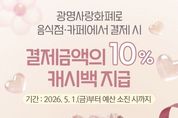 광장일보 주재영 기자 | 광명시가 5월 가정의 달을 맞아 가족 외식은 즐겁게, 골목상권은 활기차게 만드는 특별한 캐시백 혜택을 제공한다. 시는 오는 5월 1일부터 5월 한 달간 음식점·카페에서 광명사랑화폐로 결제하는 경우 결제 금액의 10%를 환급하는 ‘가족 외식비 캐시백 지원사업’을 추진한다고 28일 밝혔다. 이번 사업은 고물가 상황에서 외식 수요가 집중되는 가정의 달을 맞아 시민들의 가계 부담을 실질적으로 덜어주는 한편, 소비 침체로 어려움을 겪는 지역 소상공인을 돕기 위해 마련했다. 캐시백 혜택은 광명사랑화폐 가맹점 중 음식점과 카페에서 결제할 때 적용된다. 특히 지역화폐 사용처를 오는 8월 31일까지 고유가 피해지원금 기준에 맞춰 연매출 30억 원 이하 업체까지 한시적으로 확대하면서, 가족 외식비 캐시백 혜택을 받을 수 있는 가맹점 범위도 함께 넓어졌다. 결제액(인센티브, 정책수당 결제분 제외)의 10%를 1인당 최대 1만 원까지 광명사랑화폐로 즉시 환급받을 수 있으며, 준비된 예산이 소진하는 경우 조기 종료한다. 지급된 캐시백은 지급일로부터 1개월 이내 사용해야 하