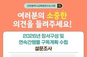 광장일보 주재영 기자 | 인천광역시교육청연수도서관은 9월 23일부터 3주간 ‘2026년 장서 구성 및 연속간행물 구독 계획 수립’을 위한 설문조사를 진행한다. 이번 조사는 2026년도 장서 구입과 자료 서비스 개선, 연속간행물 구독 목록 선정에 활용될 예정이며, 연수도서관을 이용하거나 관심 있는 시민이라면 누구나 참여할 수 있다. 종합·어린이·디지털자료실 현장 또는 연수도서관 누리집에서 참여 가능하며, 도서관을 직접 찾아 설문에 참여한 시민들에게는 소정의 기념품도 제공한다. 연수도서관 관계자는 “시민과 함께 도서관을 만들어가며 수요자 맞춤형 장서 구성으로‘미래를 열어가는 행복한 도서관’을 실천하겠다”며 적극적인 참여를 당부했다. 자세한 사항은 연수도서관 정보자료과로 문의하면 된다.