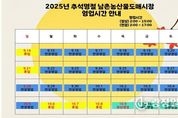 광장일보 주재영 기자 | 인천광역시 남촌농축산물도매시장관리사무소는 다가오는 추석 명절을 맞아 시민들이 안전하고 편리하게 도매시장을 이용할 수 있도록 종합대책을 마련·추진한다고 밝혔다. 이번 대책은 농·축산물 수급 안정과 함께 안전, 교통, 환경 관리에 중점을 두고 추진한다. 먼저 농·축산물 수급 안정을 위해 사과, 배, 배추, 무, 양파, 마늘, 감자, 밤, 대추 등 9개 주요 농산물 4,936톤과 소·돼지고기 등 축산물 592톤을 공급한다. 이는 지난해보다 15% 이상 늘어난 물량으로, 성수품을 충분히 확보해 시민들이 평시보다 저렴한 가격에 구매할 수 있도록 할 계획이다. 또한 시민들의 장보기 편의를 위해 시장 영업시간을 기존 오후 3시에서 오후 5시까지 2시간 연장한다. 정기 휴무일인 9월 28일과 10월 5일에도 정상 운영해 추석 장보기에 불편이 없도록 할 계획이다. 다만 추석 연휴 기간인 10월 6일부터 8일까지는 휴업하고, 9일부터 영업을 재개한다. 아울러, 불법 유통행위와 거래질서 위반을 막기 위한 지도·단속반을 편성해 운영한다. 비상장