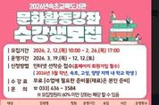 광장일보 이현나 기자 | 속초교육도서관은 관내 학생 및 학부모·지역주민들의 지속 가능한 배움을 통한 자기성장을 위해 ‘2026년 문화활동강좌’ 수강생을 모집한다. 이번 강좌는 3월 19일부터 12월 12일까지 운영되며, 초등학생 대상 △어린이 글로 표현하는 세상 등 7개 강좌, 중·고등학생 대상 △핵심을 잡아주는 고등논술 등 2개 강좌, 학부모·지역주민 대상 △포토샵 자격증반 등 5개 강좌로 총 14개 프로그램이 운영된다. 수강 신청은 2월 12일부터 2월 26일까지 속초교육도서관 누리집을 통해 신청 가능하며, 스마트폰 활용교육 강좌는 방문을 통해 선착순으로 신청할 수 있다. 김주희 관장은 “지역주민 누구나 학습을 통해 배우고 성장할 수 있도록 평생교육의 기회를 지속적으로 확대·지원할 것이다.”라고 전했다. 자세한 내용은 속초교육도서관 누리집 공지사항을 참고 하거나 담당자에게 문의하면 된다.