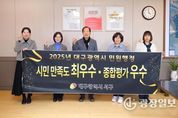 광장일보 주재영 기자 | 대구 서구청은 대구시에서 실시한 2025년 민원행정 시민 만족도 조사에서 최우수, 종합평가에서 우수 기관에 선정됐다고 밝혔다. 대구시는 민원행정서비스 품질 향상을 위해 매년 ‘민원행정 시민 만족도 조사’를 실시하고 있다. 시민 만족도 조사는 지난해 10월부터 올해 9월까지 민원 서비스를 이용한 시민을 대상으로 민원 서비스 과정, 서비스 결과, 민원 응대 태도 및 전반적인 만족도에 대해 전화 설문의 형태로 이루어졌으며, 서구는 9개 구·군 중에서 가장 높은 종합만족도 96.8점을 얻어 ‘최우수’기관으로 선정되는 쾌거를 이루었다. 또한 서구는 대구시에서 매년 실시하고 있는 민원행정 종합평가에서도 3년 연속‘우수’기관으로 선정되는 영예를 안았다. 대구시의 민원행정 종합평가는 9개 구·군의 민원제도 운영 분야 14개 지표와 민원처리 현황 분야 8개 지표 등 총 22개 지표에 걸쳐 이루어진다. 서구는 안전한 근무환경 조성, 스마트 민원서비스 운영 지원, 고충민원 처리·관리 및 해결 노력 등 전반적인 분야에서 높은 평가를 받았다. 특히, 2일 이상 법정민원 처