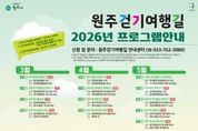 광장일보 이현나 기자 | 트레킹 도시 원주시는 3월부터 11월까지 ‘2026년 원주걷기여행길 프로그램’을 운영한다. 이번 프로그램은 원주의 역사·문화·생태 자원을 직접 보고, 느끼고, 체험하는 활동을 통해 걷기 운동을 확산하고 시민 건강 증진에 기여하는 것을 목표로 한다. 원주시는 지난해 연인원 50만 명 이상이 찾은 치악산둘레길, 원주굽이길, 원주소풍길 등 우수한 걷기길 인프라를 바탕으로 연간 40여 개의 다양한 걷기 행사와 프로그램을 운영해 시민들로부터 큰 호응을 얻었다. 올해에도 맨발걷기, 함께걷기, 역사길걷기, 야간걷기 등 다채로운 걷기 프로그램과 함께 걷기 강연 및 교육을 운영해 시민들이 일상 속에서 걷기의 즐거움과 건강을 함께 누릴 수 있도록 할 예정이다. 매월 첫째 주 토요일에는 소풍길 1코스 운곡솔바람숲길에서 ‘원주힐링 맨발걷기’ 행사가 열린다. 총 3㎞ 전 구간이 소나무 숲으로 조성된 이곳은 피톤치드가 가득한 힐링 공간으로, 지난해에만 11만 명이 찾은 ‘맨발걷기의 성지’로 알려져 있다. 원주시는 지난해 6월과 9월 원주맨발걷기축제를 성공적으로 개최하며 맨발걷기 문화 확산에 앞장섰다