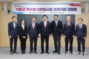 광장일보 주재영 기자 | 부산시는 어제(20일) 오후 4시 경상남도청 도정회의실에서 개최된 '낙동강 취수원 다변화사업 관계기관 간담회'에서 물 문제 해결을 위한 의미있는 논의를 진행했다고 밝혔다. 간담회에는 박형준 부산시장, 박완수 경상남도지사, 박상웅 국회의원, 의령군수, 창녕군수, 기후에너지환경부 물이용정책관, 창녕군 반대대책위원장 등 총 7명이 참석하여 사업 전반과 주민 우려사항을 심도 있게 논의했다. 또한 합천군을 비롯해 수혜 지역인 창원시·양산시·함안시·김해시 부단체장이 배석하는 등 관련 지자체가 모두 함께해 자리를 더욱 뜻깊게 했다. 이번 간담회는 ▲[기후에너지환경부] 낙동강 취수원 다변화사업 추진상황 보고 ▲[부산시] 취수지역 상생협력방안 보고 ▲[토론] 질의응답 및 기관별 입장 공유 순으로 진행됐다. 기후부는 낙동강 취수원 다변화사업 추진상황을 그동안 반대대책위원회가 제시한 주요질의에 대한 응답 형식으로, ▲지점별 취수계획 ▲지하수위 영향범위 ▲지하수위 감소 대책 ▲손실보상 방안 등을 설명했다. 부산시는 ▲부산-창녕 상생발전기금 조성 ▲창녕군 출신 학생 장학금·기숙사 지원
