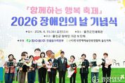 광장일보 주재영 기자 | 울진군은 장애인복지시설(2개소) 및 단체(7개소) 주관으로 지난 4월 15일‘2026년 장애인의 날 기념식’을 개최했다. 이번 행사는 “당연한 일상, 모두가 누릴 수 있도록”이라는 주제로 장애인과 비장애인이 함께 어우러지는 통합의 장으로 마련됐으며, 장애인 기관·단체 관계자와 장애인 및 가족, 자원봉사자 등 800여 명이 참석했다. 기념식은 1부와 2부로 나뉘어 진행됐다. 1부에서는 고고장구 축하공연을 시작으로 장애인복지 증진에 기여한 유공자 표창 수여, 기념사 및 격려사 등이 이어지며 화합의 시간을 가졌다. 2부에서는 마술공연과 연예인협회(울진군지부)의 재능기부 공연이 펼쳐져 참석자들에게 즐거움을 선사했다. 울진군 관계자는“장애인들이 차별 없이 살아갈 수 있는 사회, 누구나 존중받고 가능성을 펼칠 수 있는 울진을 만들기 위해 노력하고 있다”며“앞으로도 비장애인들이 누리는 당연한 일상이 장애인에게 더 이상 바람이 아닌 현실이 되는 그날까지 최선을 다하겠다”라고 말했다. 한편 장애인의 날은 장애인에 대한 이해를 높이고 재활의욕을 고취하기 위해 제정