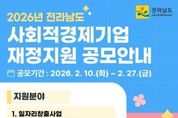 광장일보 주재영 기자 | 전라남도는 오는 27일까지 사회적경제기업의 지속적이고 안정적인 성장과 자립을 지원하기 위한 2026년 사회적경제기업 재정지원사업 공모를 추진한다. 이번 공모는 ▲일자리창출 지원 ▲사업개발비 지원 ▲시설장비 지원 ▲시군 지역 특화사업 지원, 4개 분야로 나눠 530여 기업에 총 49억 원을 지원할 예정이다. 지난해(27억 원)보다 대폭 확대된 규모다. 특히 올해는 기업 선호도가 높은 인건비에 국비 지원이 재개되고, 도 자체 지원도 확대해 기업의 고용 부담을 완화하고 안정적 일자리 창출을 적극 지원할 방침이다. 일자리창출사업은 진입 초기 사회적기업을 대상으로 취약계층 고용 1명당 월 50만~90만 원을 최대 3년간 인건비로 지원하며, 도 자체 지원사업인 전남형 일자리창출사업은 일반인력과 전문인력까지 추가로 지원한다. 사업개발비 사업은 사회적경제기업의 제품 품질개선, 디자인과 시제품 제작, 홍보비 등 최대 1억 원을 지원한다. 시설장비 사업은 기업이 신규 시설장비를 구입하거나 노후 시설장비 교체 시 최대 2천만 원을 지원한다. 이외에도 시군