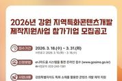 광장일보 이현나 기자 | 강원문화재단에서는 강원지역 우수 콘텐츠 발굴 및 지역 콘텐츠 기업의 성장을 도모하기 위한 공모사업을 진행한다. 31일까지 접수하는 '지역특화콘텐츠개발 제작지원사업'은 강원 지역의 문화, 관광, 역사, 전통, 인물, 생태자원 등 지역 특화 소재를 활용한 콘텐츠의 개발과 사업화를 지원한다. 강원특별자치도 소재 콘텐츠 기업을 대상으로 하며, 지원 분야는 콘텐츠 산업 전분야이다. 재단은 공모를 통해 3개 과제 내외를 선정할 예정이며, 과제당 최대 2억원을 지원하고 선정 과제의 완성도와 사업성을 높이기 위해 맞춤형 전문가 컨설팅을 제공한다. '2026년 지역 대표 글로컬 콘텐츠 제작․재투자 지원' 사업의 지역 공모도 함께 진행된다. 해외 투자유치·공동제작·진출 계약이 되어있거나 협약 기간 내 체결될 예정인 콘텐츠를 지원하며, 4월 2일까지 공모를 진행한다. 이번 공모에 대한 자세한 내용은 강원문화재단 홈페이지 또는 강원영상위원회 홈페이지를 통해 확인할 수 있으며, 문의는 강원영상위원회 로 하면 된다. 신현상 대표이사는 “지역이 가진 고유한 스