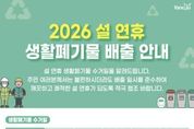 광장일보 주재영 기자 | 양주시가 설 연휴 기간 시민과 방문객의 불편을 줄이기 위해 ‘2026년 설 연휴 생활폐기물 관리 대책’을 추진한다. 양주시는 설 연휴가 시작되는 오는 2월 14일부터 18일까지를 특별 관리 기간으로 정하고, 연휴 기간 중 급증하는 생활폐기물로 인한 불편을 최소화할 방침이다. 시는 종량제봉투, 음식물류 폐기물, 재활용품 등 생활폐기물을 2월 14일과 16일 이틀간 정상 수거한다. 공동주택에서 발생하는 음식물류 폐기물은 2월 18일 별도 수거해 연휴 기간 배출된 폐기물이 장기간 방치되는 것을 막을 계획이다. 또 연휴 기간 중 쓰레기 민원과 긴급 상황에 신속히 대응하기 위해 상황근무반을 편성하는 등 비상 청소체계를 구축·운영한다. 양주시 관계자는 “설 연휴 기간 생활폐기물 발생을 줄이기 위한 시민들의 적극적인 협조가 필요하다”며 “생활폐기물은 정해진 수거 일정에 맞춰 배출해 주시고, 수거일 전날 오후 8시부터 수거일 당일 오전 6시까지 배출 시간을 반드시 지켜달라”고 당부했다.
