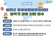 광장일보 주재영 기자 | 예천군은 관내 영유아의 건강한 성장과 창의력 발달을 지원하기 위해 예천군 영유아 창의문화센터 봄학기 프로그램 수강생을 모집한다. 해당 사업은 경상북도 내에서 유일하게 군에서 운영 지원하는 문화센터 사업으로, 작년 한 해 총 90개 과정에 3,029명이 참여하는 등 미취학 아동 가구의 큰 호응을 받았다. 올해 사업 역시 아이들이 즐겁게 배우고 성장할 수 있는 다양하고 질 높은 강좌를 개설해 이용자들의 기대감을 높였다. 세부 강좌는 ▲영유아 신체발달을 위한 ‘콩콩 베이비 체육’, ‘액티브 놀이터’, ▲오감발달 증진을 위한 ‘오감몽글아기놀이’, ▲창의성과 아동 감각 발달을 위한 ‘소리상상 뮤직클래스’, ‘리틀보이스 클래스’, ‘니브아트 스튜디오’ 등 다양한 창의·신체 활동 프로그램으로 구성됐다. 수강 신청은 23일 오전 10시부터 25일 오후 6시까지 예천군 통합교육포털을 통해 가능하며, 선착순으로 접수받는다. 프로그램은 4월부터 5월까지 2개월 과정으로, 화요일과 목요일은 예천읍 아이사랑안심케어센터 3층 댄스실에서, 토요일과 일요일은 호명읍 복합커뮤니티센터 2층 G