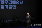 광장일보 주재영 기자 | 용인특례시는 5일 오후 수지구 용인평생학습관 큰어울마당에서 ‘한우리예술단 정기공연’이 열렸다고 6일 밝혔다. 용인특례시가 후원하고 용인민예총이 주최·주관한 이날 행사는 우리 고유의 가락과 춤을 한자리에서 만날 수 있는 전통 공연으로 꾸며졌고, 이상일 시장은 1시간 40분간 진행된 공연을 끝까지 지켜본 뒤 공연단을 격려했다. 공연은 농악, 민요, 가야금, 검무 등으로 우리 민족 고유의 소리와 정서, 삶의 이야기를 그려내 큰 박수갈채를 받았다. 할미성 농악 보존회는 꽹과리, 장구, 북, 징, 태평소 등의 악기를 활용해 역동적인 농악 판굿을 선보였다. 용인 아리랑 보존회는 청춘가, 태평가, 창부타령 등 흥겨운 경기민요를 열창하며 분위기를 이끌었다. 이어 검무가 남지연씨의 검무공연이 펼져졌다. 앙상블 더 가야금은 대중에게 친숙한 고향의 봄, 꽃타령, 까투리타령 등을 가야금 병창으로 들려주며 국악의 매력을 선사했다. 한우리예술단은 화려한 가락이 돋보이는 설장구로 타악의 진수를 보여줬다. 이상일 시장은 축사에서 “올해로 32회를 맞이한